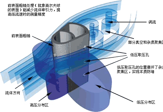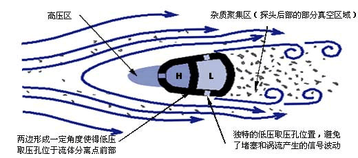 探頭的前部形成高壓區(qū),壓力略高于管道靜壓,阻止了顆粒進(jìn)入。請(qǐng)注意:在探頭的高壓取壓孔處流體的速度是零,沒(méi)有物體會(huì)進(jìn)入取壓孔。